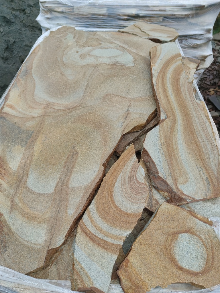 Песчаник жёлтый с разводами - для работ по мощению дорожек и площадок на землю и грунтовое основание, а также на песчано-цементно-щебёночное основание.